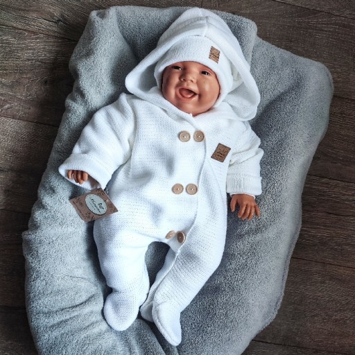 Kombinezon z kapturem włóczkowy oraz czapeczka z uszami biała rozmiar 86