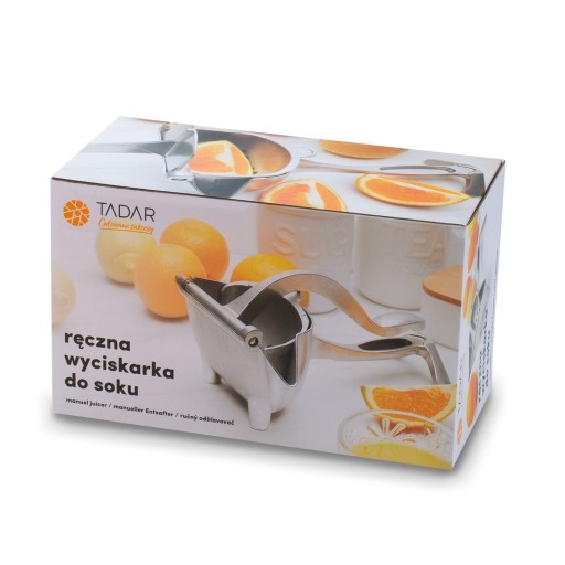 Ręczna wyciskarka do cytrusów Tadar Cytrynka jest lekka, poręczna i aluminiowa. Z jej pomocą bez wysiłku i do ostatniej kropli wyciśniesz każdy rozmiar cytrusów. Nie musisz martwić się o zbieranie i precyzję przelewania soku. Prezentowana praska do cytryn się tym zajmie. Wyciskarka ma wylewkę dla wygody przelewania zawartości. To znacznie przyspieszy robienie domowej lemoniady. Z jej pomocą wyciśniesz cytrusy każdego rodzaju. Wykorzystasz produkt nie tylko do cytryn i pomarańczy, ale nawet do grejpfrutów. Warto też dodać, że łatwo zapobiegniesz pryskaniu soku podczas wyciskania. Zyskasz praskę-wyciskacz do cytryn, który można szybko rozłożyć i umyć. Stabilnie postawisz ją na blacie i nie zarysujesz go podczas użytkowania. To dlatego, że model ma antypoślizgowe nóżki.