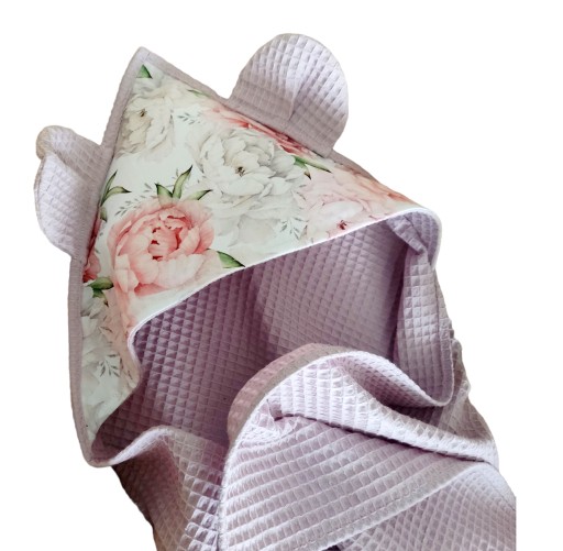 Śliczny ręcznik dla niemowląt z kapturkiem i uszkami z naturalnej 100% tkaniny bawełnianej wafel, oraz tkaniny bawełnianej.