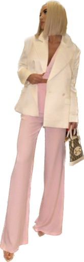 Marynarka o lekko luźnym oversize kroju "boxy" - fason z poduszkami i poszerzoną linią ramion, dzięki czemu nadaje stylowe wykończenie na co dzień do sportowych, jak i elegancki stylizacji. Wykonana z satynowej sztywno-układającej się tkaniny w kolorze ecru. Klasyczny dekolt z kołnierzykiem i klapami zapinany z przodu na logowany czarny guzik. W dolnej części marynarki znajdują się dwie kieszenie, a u góry po lewej stronie imitacja kieszonki. Model w podobnej jasnej kolorystyce. Zapinana na logowane kremowe guziki, które także znajdują na dole rękawów jako dekoracja w mniejszej wersji.