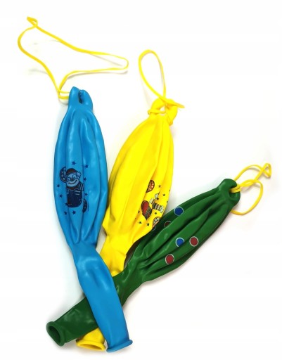 Każdy posiada kolorowy nadruk i przymocowaną gumową pętelkę do trzymania.