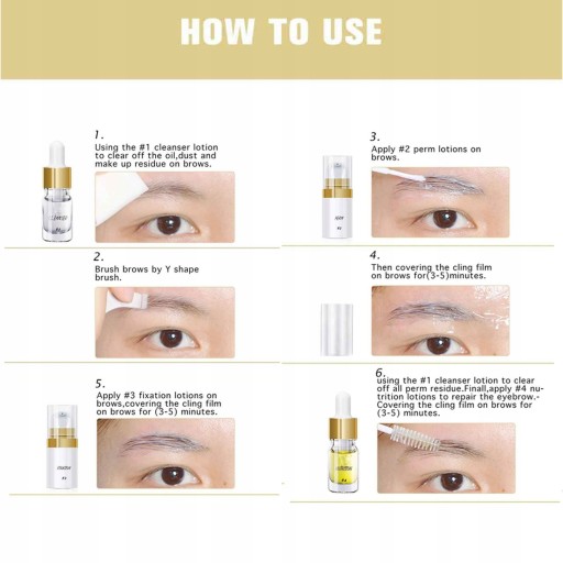 1. Użyj środka czyszczącego, aby usunąć brud i pozostałości z brwi.2. Szczotkuj brwi w kształcie litery Y3. Nałóż płyn do trwałej ondulacji na brwi, a następnie przykryj je folią (3-5) minut4. Nałóż balsam utrwalający na brwi i przykryj je folią (3-5) minut5. Użyj środka czyszczącego, aby usunąć pozostałości trwałej ondulacji. Na koniec zastosuj odżywczy roztwór do naprawy brwi, owiń je folią (3-5) minut.