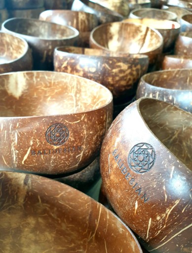 Miski wykonane są z łupin orzechów kokosowych. Każda z nich jest przycinana, szlifowana i polerowana ręcznie na Bali. Miski nie są poddawane żadnym obróbkom chemicznym i są w 100% ekologiczne. Nadają się idealnie do deserów, owocowych smoothie, sałatek lub nawet zup.