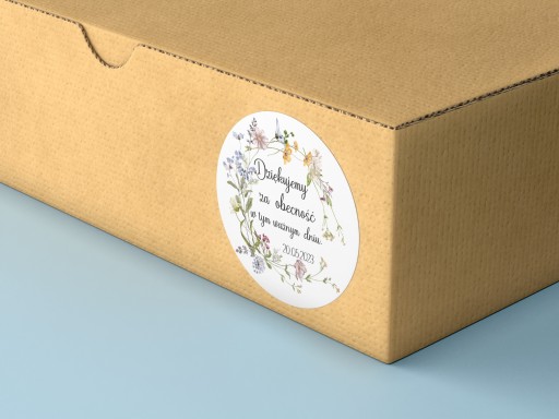 Przedmiotem oferty są personalizowane okrągłe samoprzylepne naklejki z wzorem kwiatów.