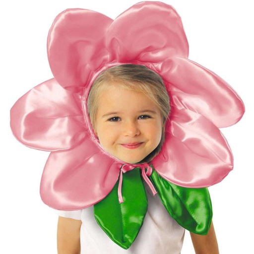 Czapka na kształt pięknego kwiatka z zielonymi listkami. Czapka wykonana z atłasu, wiązana pod szyją. Idealnie sprawdzi się jako element przebrania na bal przebierańców, karnawał lub szkolne przedstawienie.