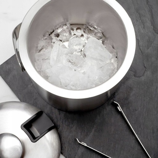 Zaprezentowane wiaderko do lodu powstało ze stali szlachetnej. Jego projekt otrzymał błyszczące wykończenie oraz miejsce w pokrywie – podkreślone czarnym tworzywem sztucznym – gdzie bez problemu schowasz szczypce, potrzebne do nakładania kostek lodu do szklanek gości.