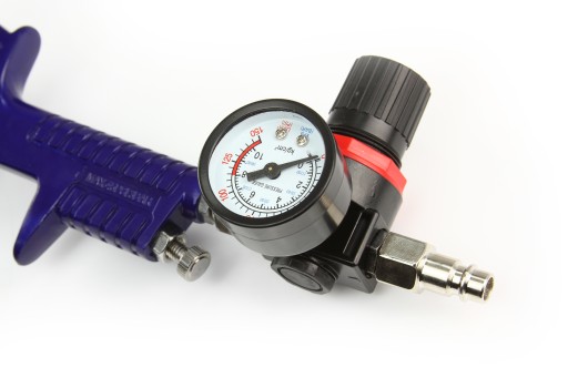 Pokrętło regulacji ciśnienia pozwala regulować ciśnienie powietrza docierającego do pistoletu z kompresora.