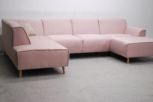 Wypoczynek jest fabrycznie nowy wykonany z wysokiej jakości tkaniny strukturalnej średnim splocie. Kanapa jest w kolorze blady róż. Narożnik jest bez funkcji spania.