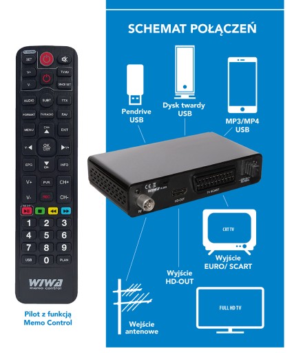 Nowoczesny tuner drugiej generacji WIWA H.265 obsługuje darmowe kanały nadawane w naziemnej telewizji cyfrowej w najnowszej technologii H.265/HEVC. Jest to standard, który będzie obowiązywał w Polsce. Tuner jest kompatybilny ze starszymi technologiami H.264 i MPEG-4, które są aktualnymi standardami nadawania w Polsce. Tuner sterowany pilotem z funkcją Memo Control (programowalne przyciski – umożliwiające obsługę dekodera i odbiornika TV jednym pilotem). Sprzęt posiada cyfrowy wyświetlacz oraz podstawowe przyciski funkcyjne na panelu przednim. OSD w języku polskim - wyświetlane na ekranie telewizowa, przejrzyste intuicyjne, łatwe w obsłudze.