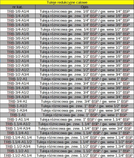 Poniżej przedstawiamy pełen katalog tulei różnicowych calowych redukcyjnych: