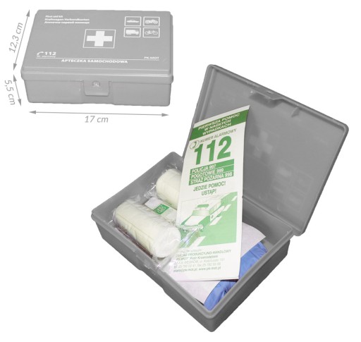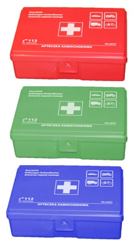 In accordance to the legal requirements, all medical devices included in the kit include the CE marking. The first-aid kit contains sterile and non-sterile medical devices. Medical devices are disposable. All products with a valid date should be checked regularly! Attention: Keep out of the reach of children. A properly completed first aid kit should be stored in a dry and shaded place as possible. Manufacturer: ZPH PK-MOT, Made in Poland, nr SRN: PL-PR-000027277