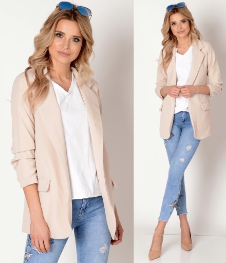 Model dłuższy, smokingowy pasujący do eleganckiego jaki i casualowego stylu. Doskonałe dopełnienie stylizacji do pracy, na uczelnie lub na wieczorne wyjście. Oryginalnego charakteru dodają drapowane rękawy o długości 3/4. Dwie kieszonki po bokach z efektownymi klapami upiększają marynarkę. Fason luźny, z podszewką i miękkimi poduszkami w ramionach.