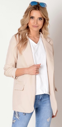Model dłuższy, smokingowy pasujący do eleganckiego jaki i casualowego stylu. Doskonałe dopełnienie stylizacji do pracy, na uczelnie lub na wieczorne wyjście. Oryginalnego charakteru dodają drapowane rękawy o długości 3/4. Dwie kieszonki po bokach z efektownymi klapami upiększają marynarkę. Fason luźny, z podszewką i miękkimi poduszkami w ramionach.