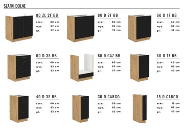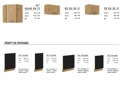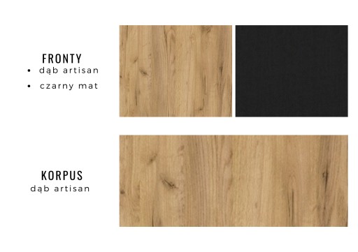 Front: płyta laminowana 16 mm dąb artisan / czarny mat / obrzeże ABS