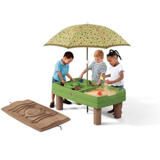 Stół - wodna piaskownica amerykańskiej firmy STEP2 pozwala na zabawę w piasku i w wodzie. Do stołu dołączono parasol w celu ochrony dziecka przed promieniami słońca. Zainstalowany korek spustowy ułatwia spuszczanie wody. Dołączone są też różne akcesoria..