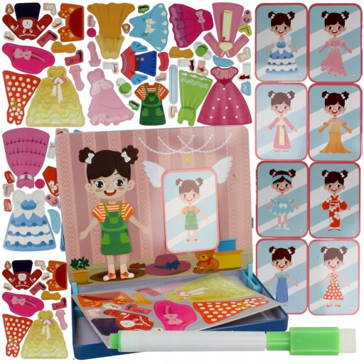 Kreatywna zabawka składa się z książeczki, kart z gotowymi propozycjami stylizacji oraz zestawu 73 magnetyczne puzzle w kształcie różnych elementów garderoby oraz różne dodatki.