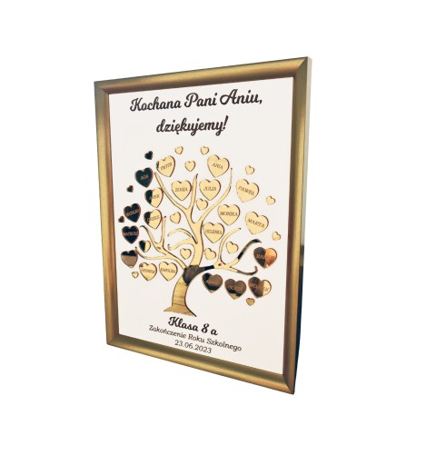 Na drzewku jest maksymalnie 26 serduszek, na których grawerujemy imiona dzieci. Jeśli dzieci jest mniej - serduszko pozostanie puste.