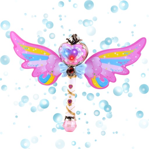 ❤️ Magiczna maszynka do baniek mydlanych w kształcie różdżki.Wykonana została delikatnych pastelowych odcieniach różu, fioletu i niebieskiego które wspólnie tworzą harmonijną kompozycję, która od razu przyciąga wzrok. Złote detale, w tym misternie zdobione elementy oraz błyszczący czerwony kryształ na środku, dodają jej niezwykłego blasku i elegancji
