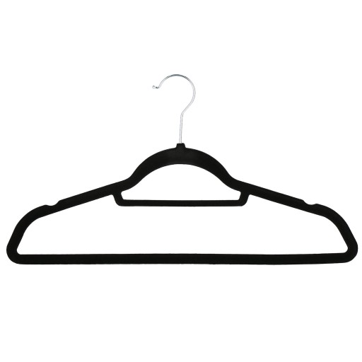 Opływowy kształt wieszaka sprawia, że ubrania stabilnie trzymają się jego powierzchni. Dodatkowym atutem produktu jest wykończenie welurowe i specjalne wcięcia po bokach, dzięki którym bluzki, koszule, marynarki i sukienki nie zsuwają się.