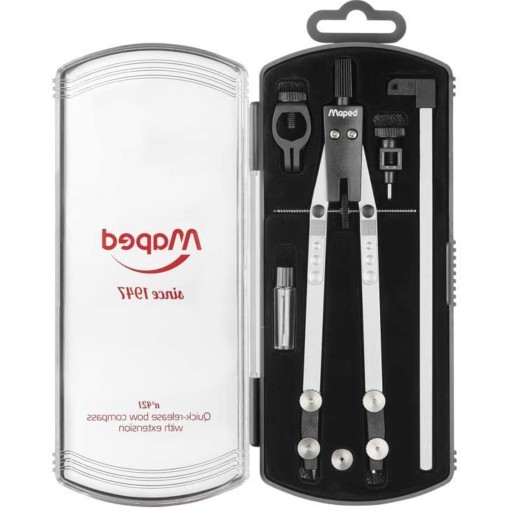 Cyrkiel techniczny geometryczny Maped składa się z sześciu elementów. Ten typ cyrkla jest bardzo praktyczny, ponieważ umożliwia szybkie i łatwe przestawienie długości na potrzebę pomiarów i rysunków technicznych. Cyrkiel spełnia najważniejsze wymagania dotyczące precezji.