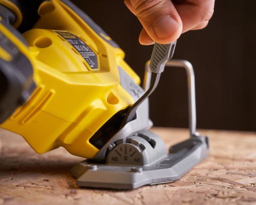 - Beznarzędziowo regulowana stopka ukosująca do 45° w obu kierunkach z ustawieniami wstępnymi 0° - 22,5° i 45° do precyzyjnych cięć ukośnych