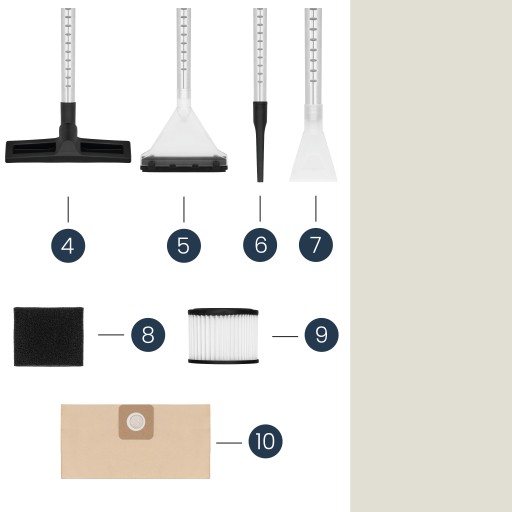 - Akcesoria: elastyczny wąż, nakładka uniwersalna do podłóg, ssawka szczelinowa, ssawka do prania tapicerki, ssawka do prania wykładzin i dywanów,