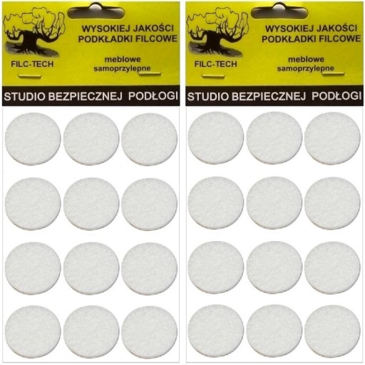 Podkładki filcowe samoprzylepne okrągłe pod meble o średnicy fi 28mm w kolorze białym. Podkładki produkowane z wysokiej jakości polskiego filcu technicznego - włóknina poliestrowa 100% (gramatura 500g/m2, grubość 2,5mm). GATUNEK I. Filc meblowy znakomicie zabezpiecza powierzchnię podłogi przed zarysowaniami. Podkładki z filcu mocowane są pod meble, szafy, krzesła, stoły, sofy, komody ... Cena za 2 blistry (2x 12szt.) podkładek filcowych.