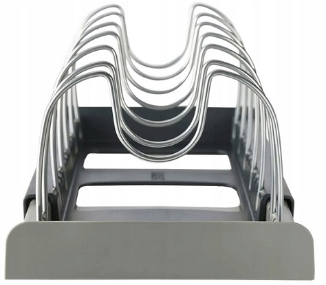 🚩Stojak wyposażony jest w 7 regulowanych ramion, które można w dowolny sposób konfigurować według potrzeb. Można zrobić większe lub mniejsze przegrody. Urządzenie jest rozsuwane w zależności od ilości naczyń które chcemy ułożyć. Minimalna szerokość to 30 cm, maksymalna 56cm.