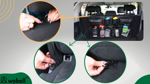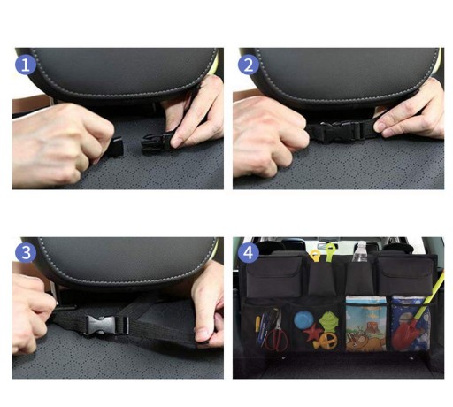 - ✅ Dodatkowo możesz wykorzystać dwa dodatkowe boczne pasy by lepiej przymocować organizer do tylnej ściany siedzeń (klamrę można włożyć między siedzisko a oparcie fotela lub między boczne oparcie fotela)