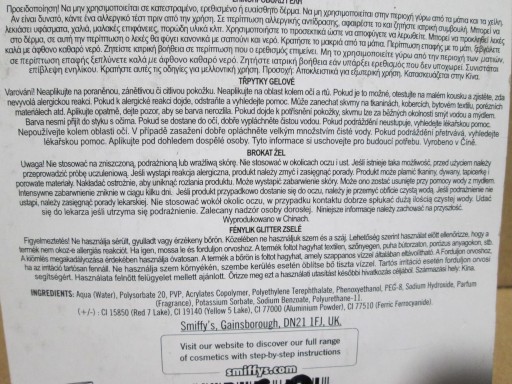 20 ml tubka złotego brokatowego żelu do twarzy i ciała „Professional FX” firmy Smiffy’s. Produkty Smiffy to bezpieczne i łatwe w użyciu produkty, które są profesjonalne, nietoksyczne, hipoalergiczne i zgodne z przepisami UE/FDA dotyczącymi kosmetyków. Podobnie jak w przypadku wszystkich produktów kosmetycznych, przed użyciem przetestuj je na małej powierzchni zgodnie z wytycznymi producenta.