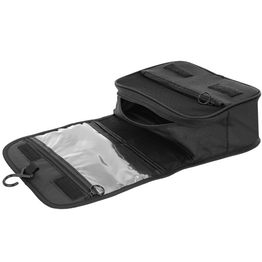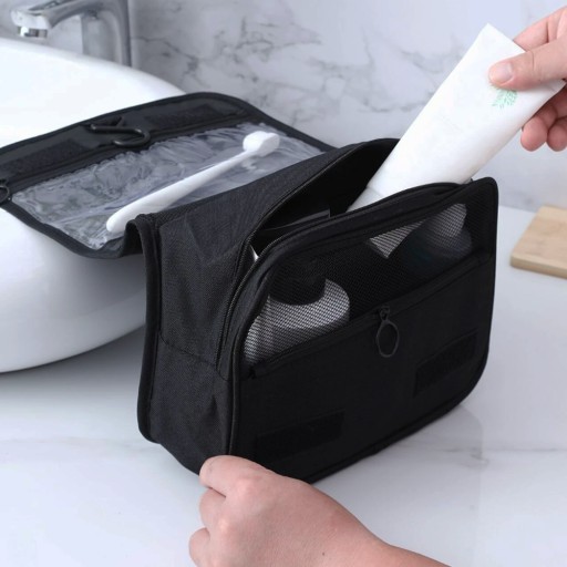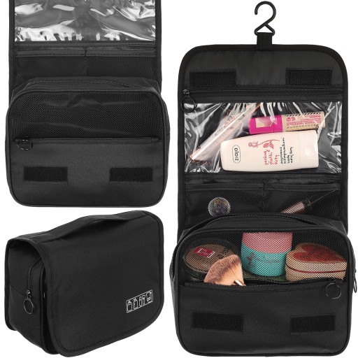 Specjalny haczyk umożliwia zawieszenie kosmetyczki, co jest niezwykle praktyczne w hotelach, na kempingach czy w domowym łazienkach, gdzie często brakuje miejsca na rozłożenie wszystkich kosmetyków.