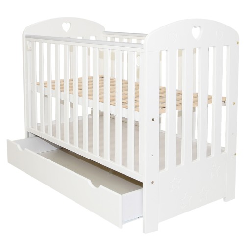 - Łóżeczko wyposażone w dolną szufladę, która pozwala na przechowywanie różnych przedmiotów.