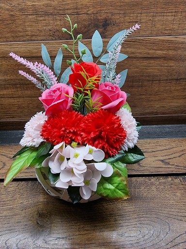 Bukiet z różami i innymi kwiatami mydlanymi to idealny prezent dla bliskiej osoby lub piękna ozdoba dla Twojego domu lub biura.