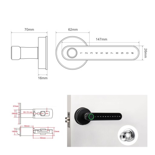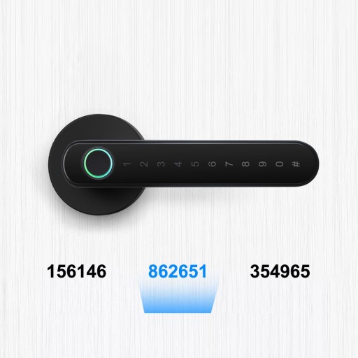- Elektroniczna klamka otwierana na odcisk palca, kod pin, za pomocą aplikacji oraz standardowym kluczem