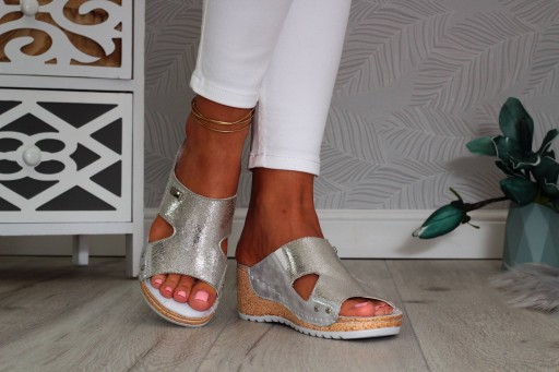 HIT klapki damskie na koturnie w kolorze srebnym, lekkie i wygodne.