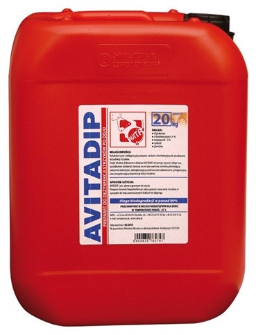 AvitaDip- antybakteryjny i pielęgnacyjny preparat na bazie chlorheksydyny do poudojowej dezynfekcji strzyków. Dzięki idealnie dobranemu składowi AvitaDip utrzymuje się przez długi czas (przedłużone działanie) tworząc na strzyku warstwę ochronną eliminując zakażenia bakteryjne, zabezpieczając przed nowymi zakażeniami, zmiękcza skórę strzyków przyspieszając jej regenerację. produkt gotowy do użycia. Opakowanie 20 litrów