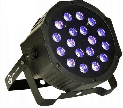 - ✅oświetlacz ultrafioletowy w postaci reflektora LED PAR UV, wyposażony w 18 mocnych, 3-watowych diod emitujących światło powodujące luminescencję niektórych barw