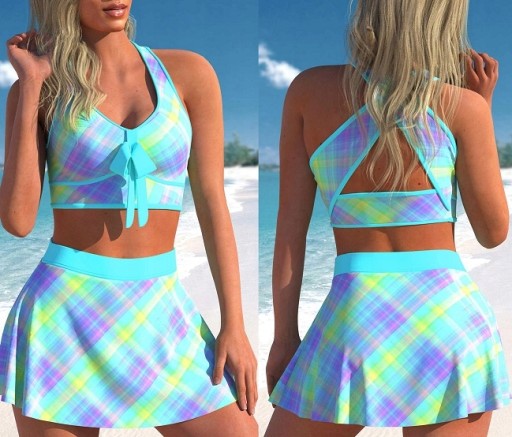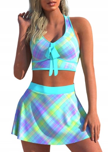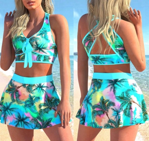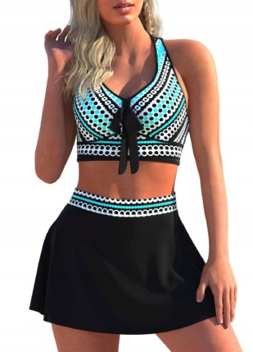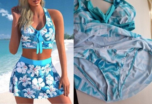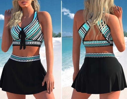 Modny od kilku sezonów dwuczęściowy strój z mixem wzorów, obecny na kostiumach kąpielowych, dzięki kolorowym printom przeniesie Cię na rajskie plaże i poczujesz letni klimat. Strój kąpielowy ze spódniczką, to idealne rozwiązanie, które pozwala podkreślić atuty kobiecego piękna, przy tym lekko korygując sylwetkę i maskując niedoskonałości. Fason z wkładką, bez fiszbin, podszyty stabilizującym materiałem pod biustem - daje możliwość dopasowania do różnych wielkości biustu. Kostium plażowy na nieco szerszych, rozciągliwych ramiączkach. Model posiada wyżej zabudowany dekolt oraz plecy (do wysokości standardowego zapięcia obwodu pod biustem - pod łopatki.