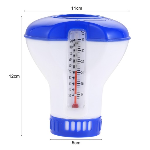 Pływający Dozownik Chloru, pływak do basenu z Termometrem na Tabletki i Granulaty posiada wbudowany dokładny termometr, który wyświetla temperaturę w stopniach Fahrenheita i Celsjusza.