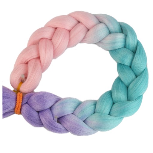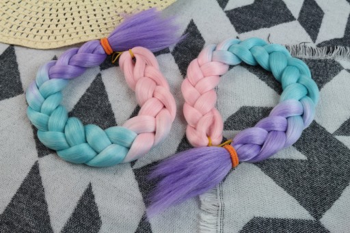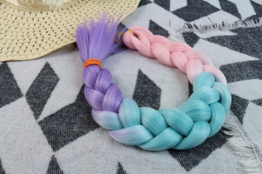 Włosy syntetyczne w przepięknym wariancie kolorystycznym -różowo-turkusowo-fioletowym. Wykonane z gładkiego i przyjemnego w dotyku henlonu.
