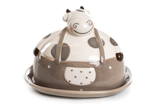 Ceramiczny maselniczka w kształcie krowy. Wykończony na połysk. Służy także jako dekoracja.