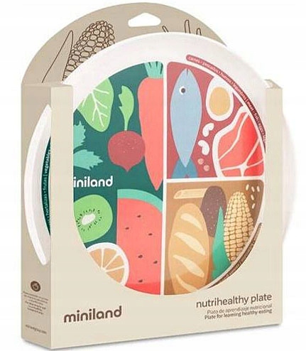 Talerz, który wspiera nawyki zdrowego odżywiania. Zachwyca kolorami oraz funkcjonalnością, jest przy tym produktem wysokiej jakości. Talerzyk ma narysowaną grafikę przedstawiającą grupy produktowe jedzenia - w jakich proporcjach powinny się znaleźć w diecie malucha. Połowa talerza to owoce i warzywa, jedna czwarta przeznaczona jest na białka (mięso, jaja lub ryby) i jedna czwarta na węglowodany (chleb, makaron, ryż).