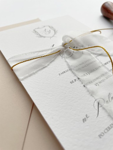 Zaproszenie jest drukowane jednostronnie na papierze o delikatnej fakturze i wysokiej gramaturze. Składa się z karty głównej zaproszenia, beżowej koperty i odbicia lakowego. Do kompletu można dokupić dodatkową kartę RSVP i wstążkę.