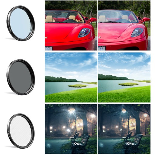 - Filtr polaryzacyjny kołowy - eliminuje odblaski, odbicia z powierzchni metalicznych i szklanych, zwiększa nasycenie kolorów