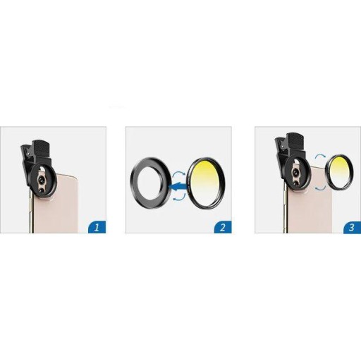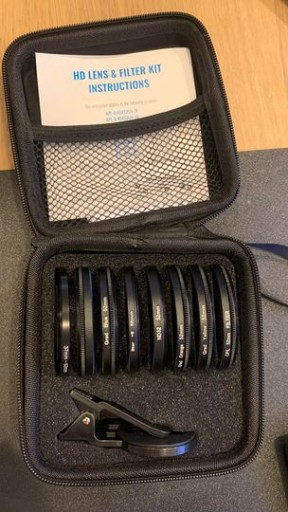 - W zestawie znajduje się 7 filtrów, etui, instrukcja obsługi, ściereczka i klips, za którego pomocą przymocujesz nakładkę do obiektywu swojego smartfona