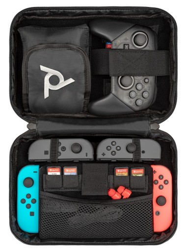 Etui może przechowywać konsolę Switch lub Switch Lite i ma wystarczająco dużo miejsca na kontroler Pro, zasilacz sieciowy, power bank, dodatkowe Joy-Cons, 14 gier i inne małe akcesoria do gier. Graczom, którzy lubią minimalizm, spodoba się stylowy, prosty design etui. Cokolwiek zabierzesz ze sobą w podróż, zmieścisz w tym etui!