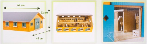 Duża drewniana stajnia wykonana została całkowicie z drewna i materiałów drewnopodobnych w skali 1:32. We wnętrzu posiada aż dziewięć boksów dla koni oraz pomieszczenie gospodarcze.