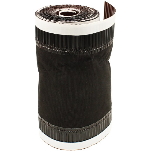 Paroprzepuszczalna taśma kalenicowa w postaci dwóch pasów plisowanego aluminium połączonych ze sobą za pomocą bardzo wytrzymalej geowłókniny wykończonych od spodu samoprzylepnymi paskami wysokiej jakości butylu.