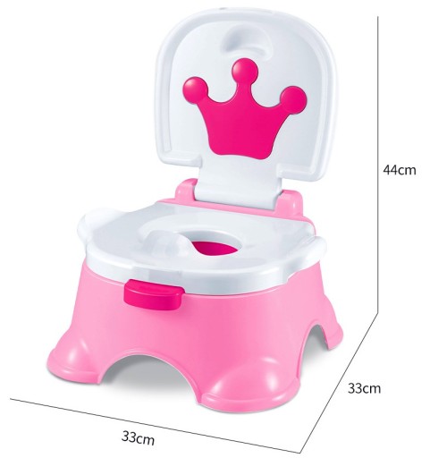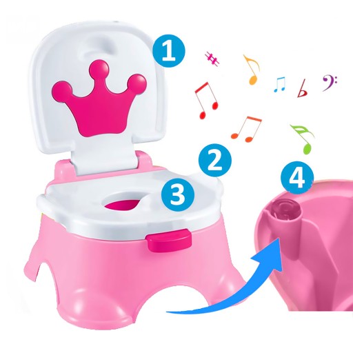 Śpiewający nocniczek umożliwi twojemu dziecku sprawną naukę korzystania z toalety zapewniając komfort i bezpieczeństwo. Nocniczek wyposażono w dwa boczne uchwyty oraz gumowe podkładki by zapewnić stabilność i przyjemność użytkowania. Specjalny wyjmowany pojemnik ułatwia czyszczenie oraz utrzymanie zestawu w czystości. Nocniczek posiada także uniwersalną nakładkę, która pasuje do większości muszli WC, dzięki czemu gdy maluch podrośnie może korzystać z toalety dla dorosłych. Po złożeniu pokrywy nocnik może posłużyć, jako taborecik pod wc lub podstawek do umywalki.
