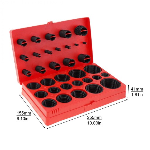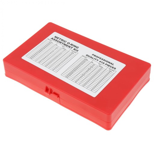 W zestawie znajduje się łącznie aż 419 szt. uszczelek w różnych rozmiarach, opakowane w solidną skrzynkę z tworzywa sztucznego.